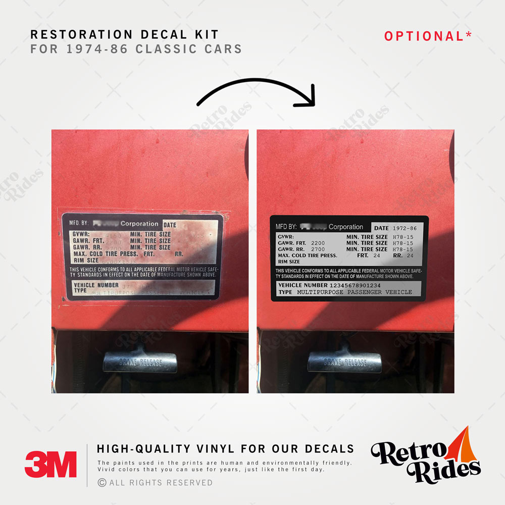 It is compatible with AMC 232, 258, 304, 360, and 401 engines. The standard year range is 1972-1986. Please contact me for additional customization. Specifically designed for CJ vehicles, the “CJ Series Restoration Decal/Sticker Kit”
